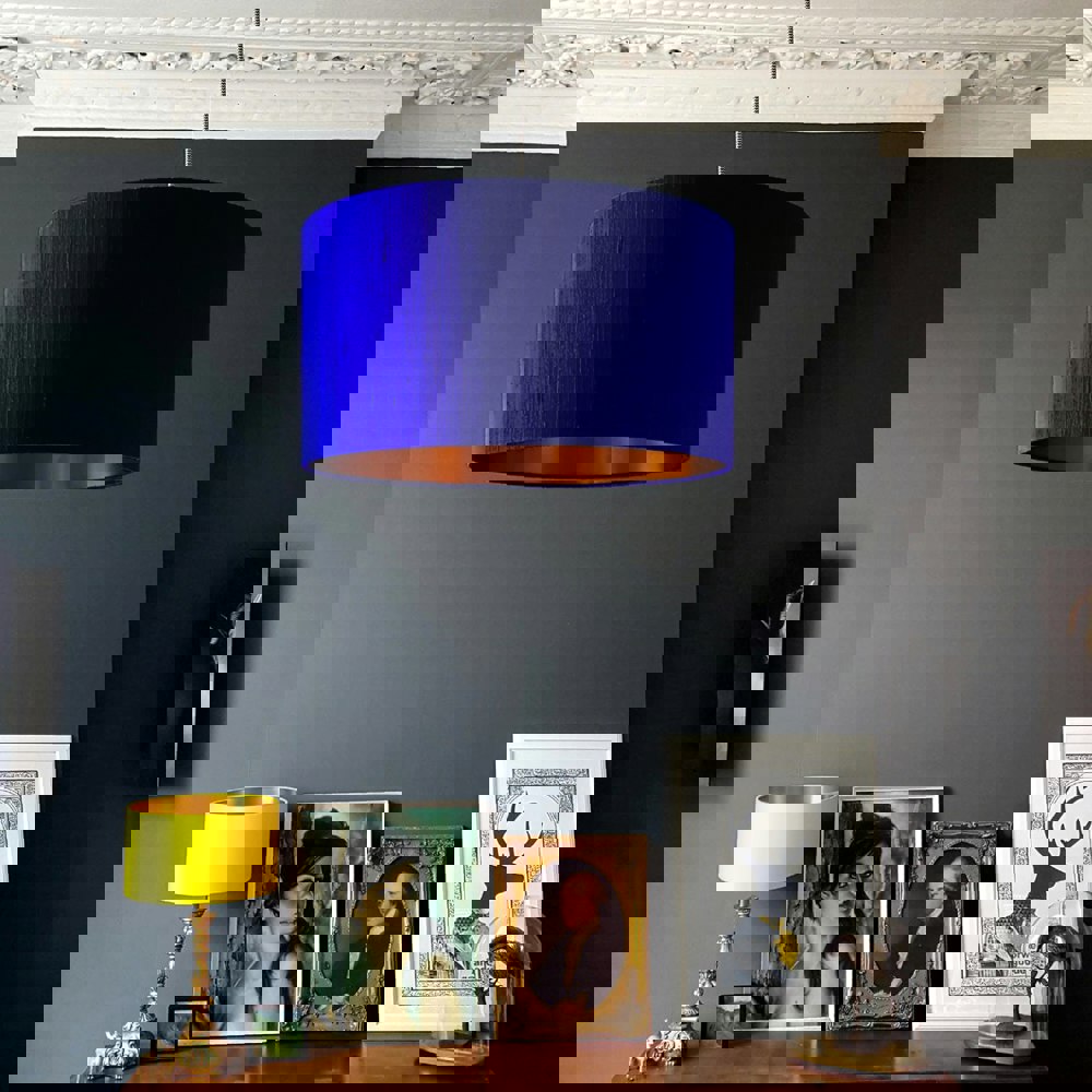 Say hello to your next statement piece. Our Electric Blue Silk Drum Lampshade is a bold burst of colour, sitting somewhere between Cobalt and Klein Blue — deep, intense, and utterly captivating. Paired with a copper foil lining, it glows with a rich, warm light that brings balance and atmosphere to this striking shade.