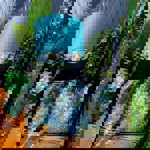 Enveloped in sumptuous jade green velvet on the exterior, this exquisite lampshade immerses you in a tropical paradise, where every detail has been thoughtfully crafted to ignite your senses. The Emerald velvet canvas depicts a serene forest of sapphire blues and emerald greens, standing tall atop a glorious sea of rolling green hills.