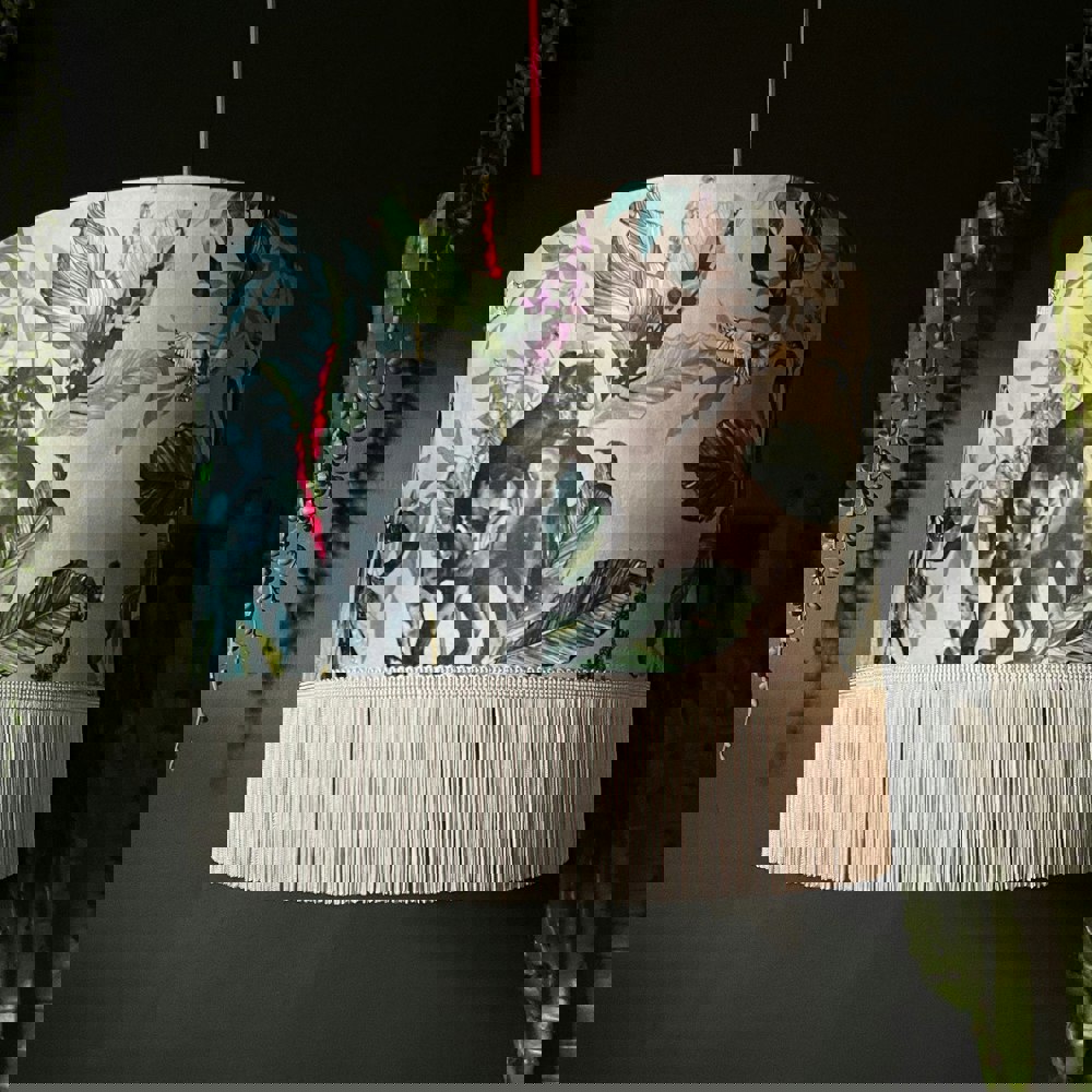 Our handmade drum lampshade in Dust with cloud grey fringing brings a ghostly, twilight magic to the collection with its cloudy grey backdrop lit only by the light of the moon. Captured at dusk our fearless feline weaves in between the shadows. The ambience is calm, eerie and almost supernatural. Our big cat Panther is joined by swooping owls ready to catch their prey. Nocturnal hunters work in solidarity through this weaving jungle.