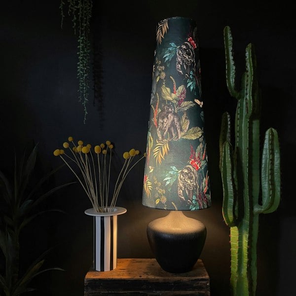 Our Wild Wood Oversized Cone Lampshades its lush, forest green tones is the colour of the season. Dark green decor is fast becoming one of our favourite go to hues and our Wild Wood design does not disappoint. With an emphasis on creeping vines, foxgloves and luscious verdant greenery. Our nocturnal hunter the black panther is lit mysteriously by the moonlight, she’s at one with nature, fearless and strong.