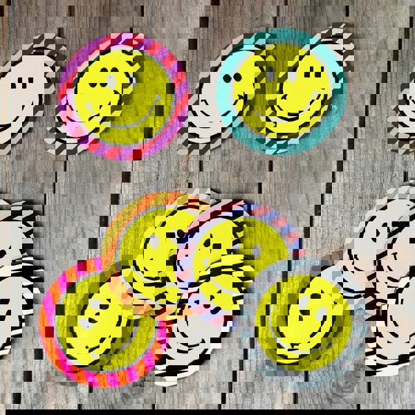 Transform your home into a joyful haven with the Love Frankie Helter Skelter Smiley Face Coasters from Love Frankie. Each coaster, adorned with a cheerful smiley face emblazoned on our iconic tilted stripe design.