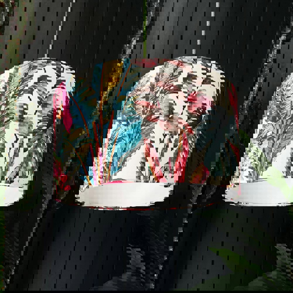 The Ice Queen sister of our best selling Acid Jungle Fabric features colour popping tones of bright pinks and cool teals which command attention on a Snow White backdrop. Paired perfectly with our metallic gold foil lining, this abstract, psychedelic jungle design paired with vibrant colours on the tropical leaves and the detailing on the poisoned berries offers a true statement lighting design.