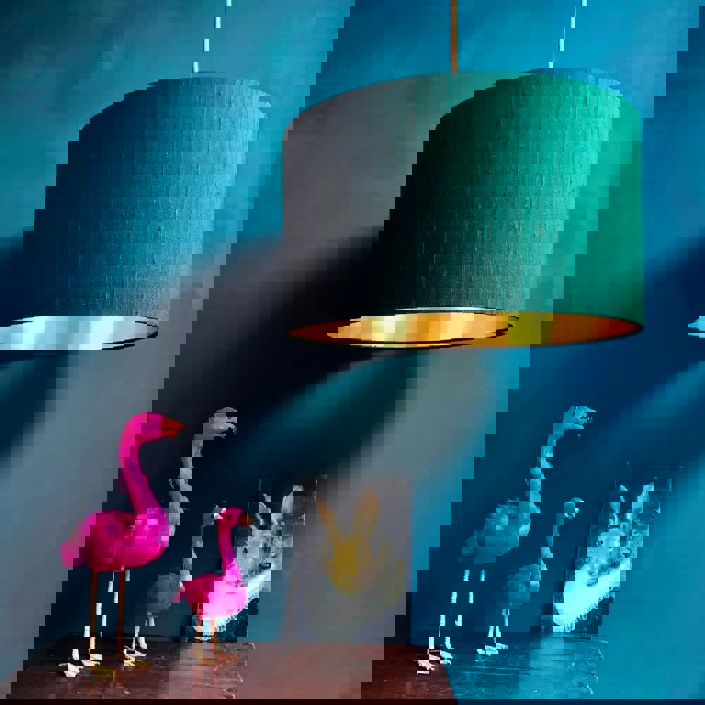 Indulge in the timeless elegance of our Indian Silk Lampshade in Forest Green, adorned with a captivating gold lining.