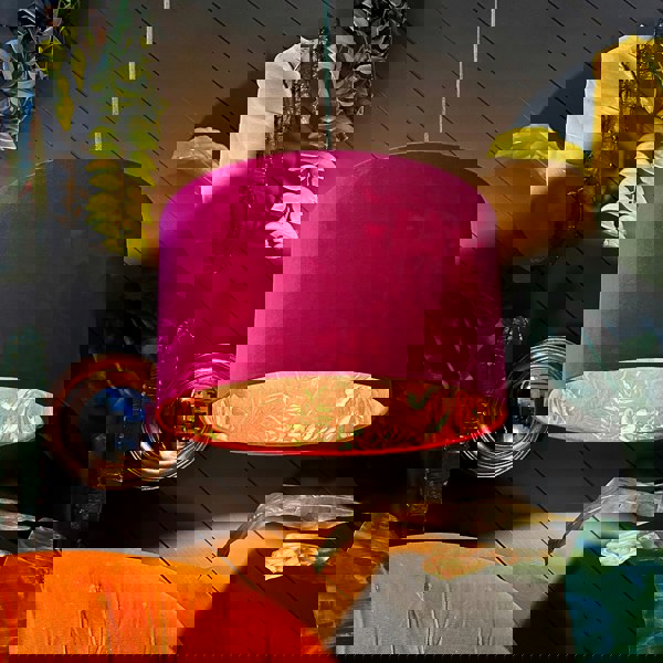 Indulge in the enchanting allure of our Jam Tart Midnight Garden Silhouette Lampshade in Raspberry Pink Velvet. Handmade to order with meticulous attention to detail, this bespoke lampshade from Love Frankie is a true masterpiece.