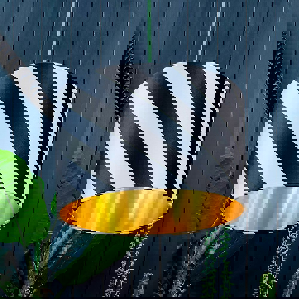 Step right up, ladies and gents, and behold the mesmerising Helter Skelter Velvet Gold Lined Lampshades - a true spectacle for your living space! With our in-house designed fabric featuring a playful Diagonal striped pattern reminiscent of the whimsical fairground favourite, these lampshades bring a touch of circus-style flair and fun into your home. The luxurious gold foil lining adds a touch of opulence while casting a warm, inviting glow. Choose from our range of eight sizes to find the perfect fit for any room. Elevate your decor with a dash of excitement - it's time to light up your space with Helter Skelter!