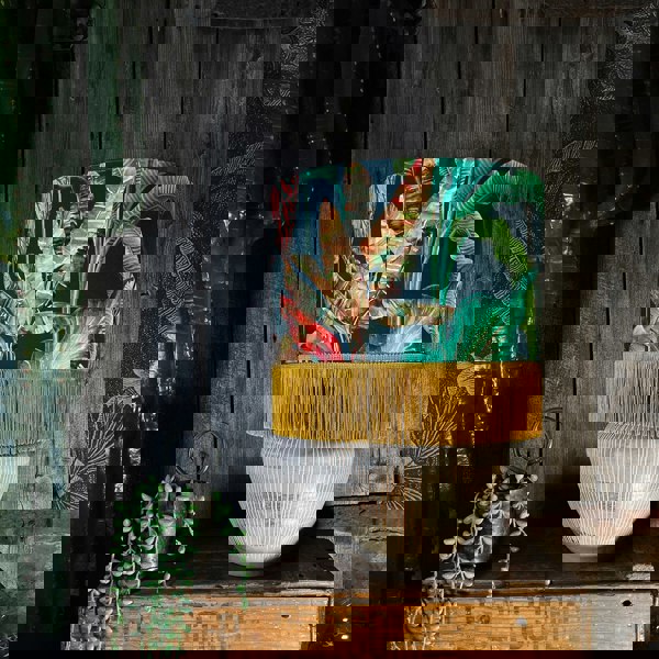 The Magic Fruits Jungle lampshades are adorned with 10cm of our glorious decadent fringing and paired wonderfully with our gold metallic lining. When lit the lampshade will emit a lovely warm ambient glow.