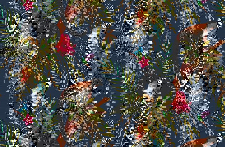 A colourful, vivacious wallpaper design featuring fabulous foliage, hummingbirds, gecko’s and of course a kooky little lemur.