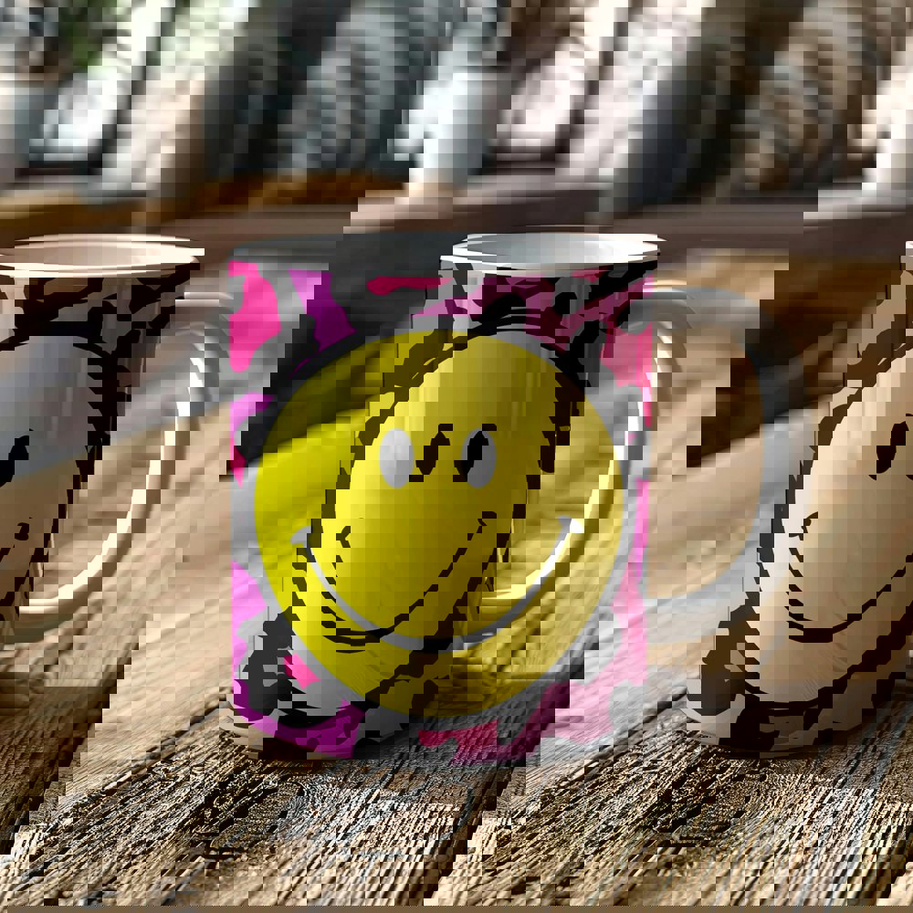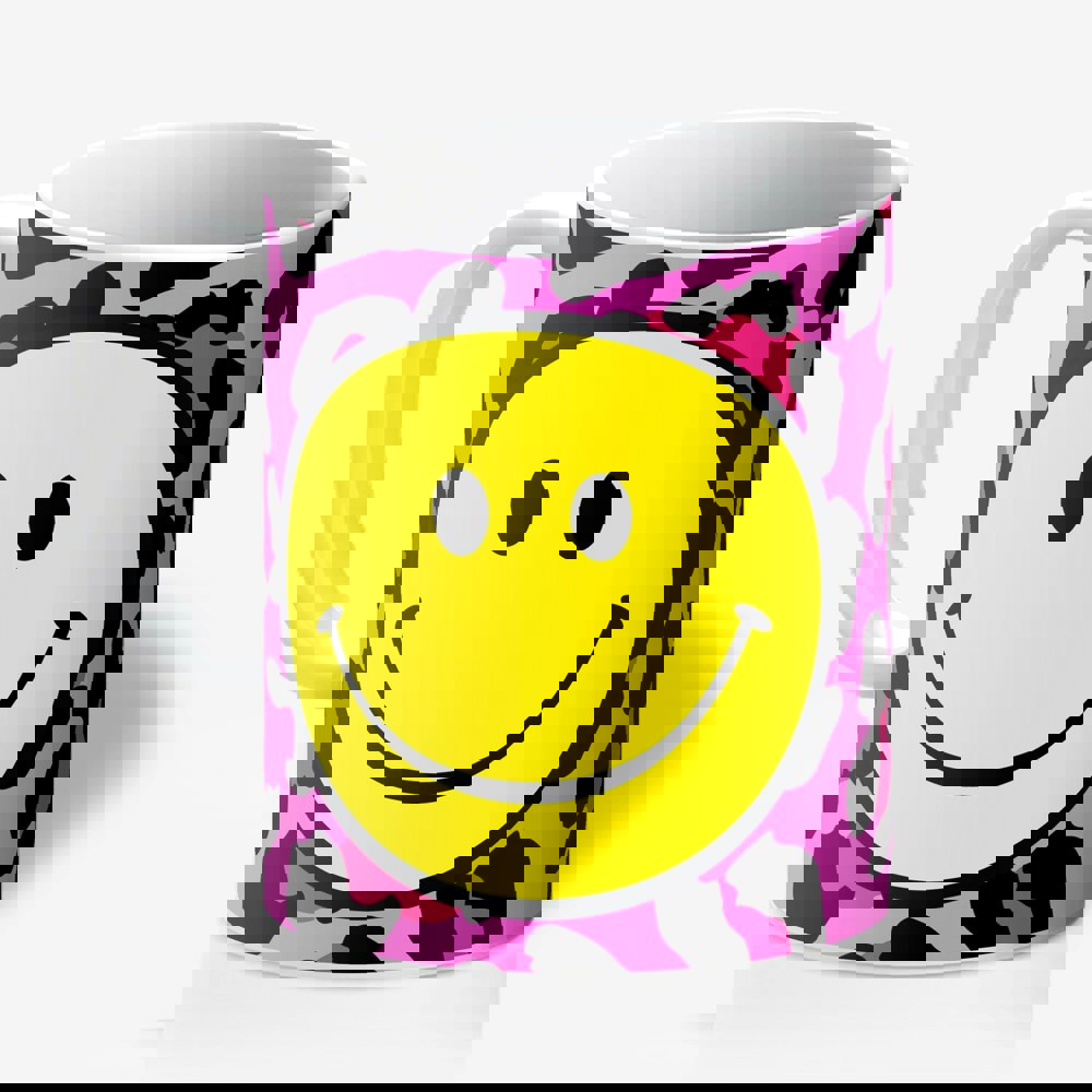 Start your day with a smile with our Pink Leopard Print Smiley Face Mug! This cheeky little number features a fabulous pink and black leopard print backdrop that’s more fashionable than your average catwalk, topped off with an acid yellow smiley face that’s practically begging you to sip some joy.
