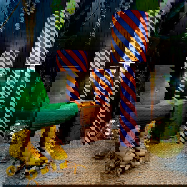Crafted with the utmost care by the talented team at Love Frankie, each lamp is a unique work of art, featuring the signature tilted stripe velvet design in a delightful blend of indigo blue and pinky peach hues. Whether you choose the hard-wired version with a flex and plug or the portable, remote-controlled LED option, these lamps are sure to transform your room into a circus of style.