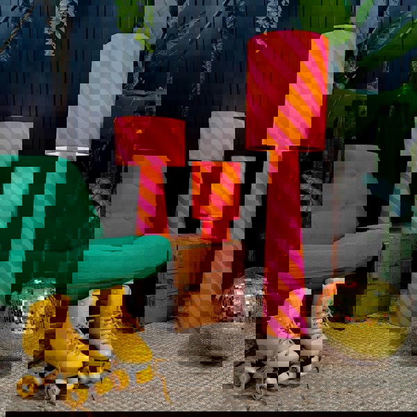 Step into a world of whimsy and wonder as you immerse yourself in the alluring tilted stripe design, reminiscent of the classic Helter Skelter carnival ride. Crafted with the finest velvet, the lamps emanate a rich, luxurious glow that transforms any space into a haven of creativity and inspiration.