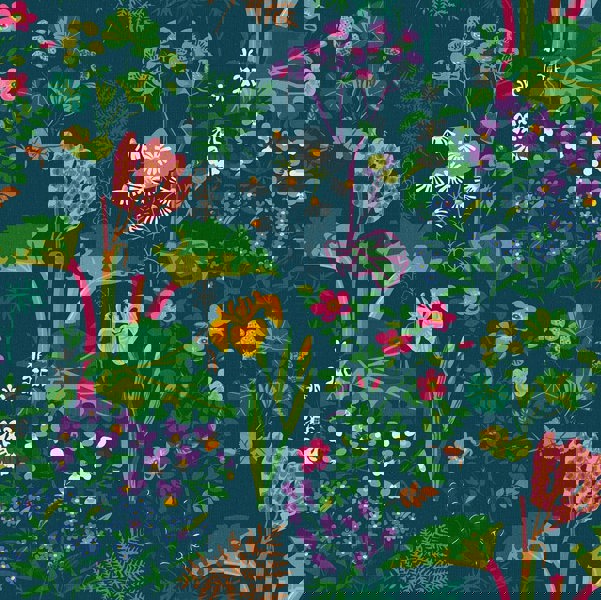 Rabarber wallpaper designed by renowned Scandinavian artist Gocken Jobs features fabulous hand drawn foliage including Rhubarb, violas and dew cups all on a sumptuous dark green backdrop.