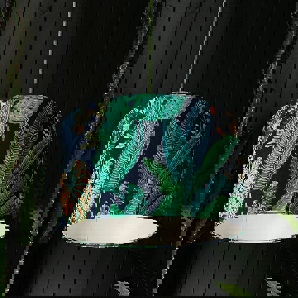 Our Rainforest Jungle lampshade will transport you to a tropical paradise of verdant foliage, vibrant blues, zesty greens and tantalising poison berries against undertones of pure lapis blue. Our Rainforest velvet lampshade featured here is simple and oh so effective. Paired with white PVC allowing an abundance of light to shine through with the light is illuminated.