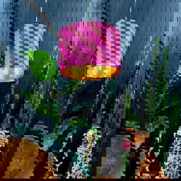 Introducing the Helter Skelter Raspberry Ripple Lampshades – where colour explodes and fun never fades. Handmade with love, these drum lampshades in Plum and Pink diagonal stripes will transform any room into a vibrant circus of light and joy. Let the playful design whisk you away to a world of spectacle and extravagance right in your own home!