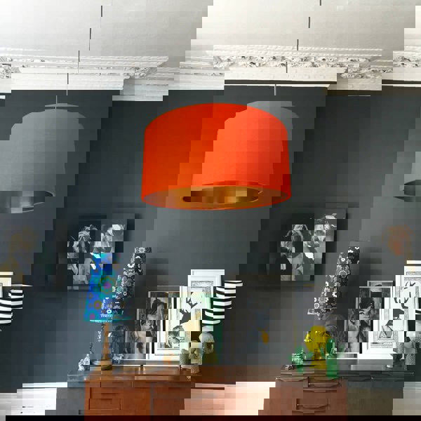 Our handmade Tangerine Orange Cotton Drum Lampshades with Gold Linings is a guaranteed statement piece that gives off all summer time vibes.