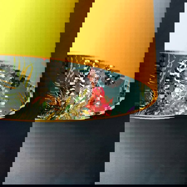This beautiful silhouette lampshade is made using our kooky lemur wallpaper in Teal on the inside and a lush egg yolk yellow cotton on the outside. Allowing the print on the inside of the shade to subtly appear when the light is illuminated.