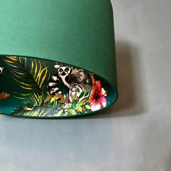Handmade using our best selling kooky lemur wallpaper in Teal on the inside of the lampshade and a rich hunter green cotton on the outside.