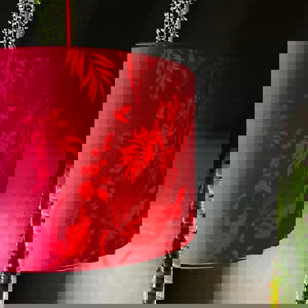 Our Silhouette drum lampshade in Twilight Blue and Watermelon cotton brings a ghostly, adds an air of mystery to the range. The deep midnight blue tones in the Wallpaper are paired adoringly with our bright Watermelon Pink cotton showcasing the flora and fauna in all its vibrant glory.