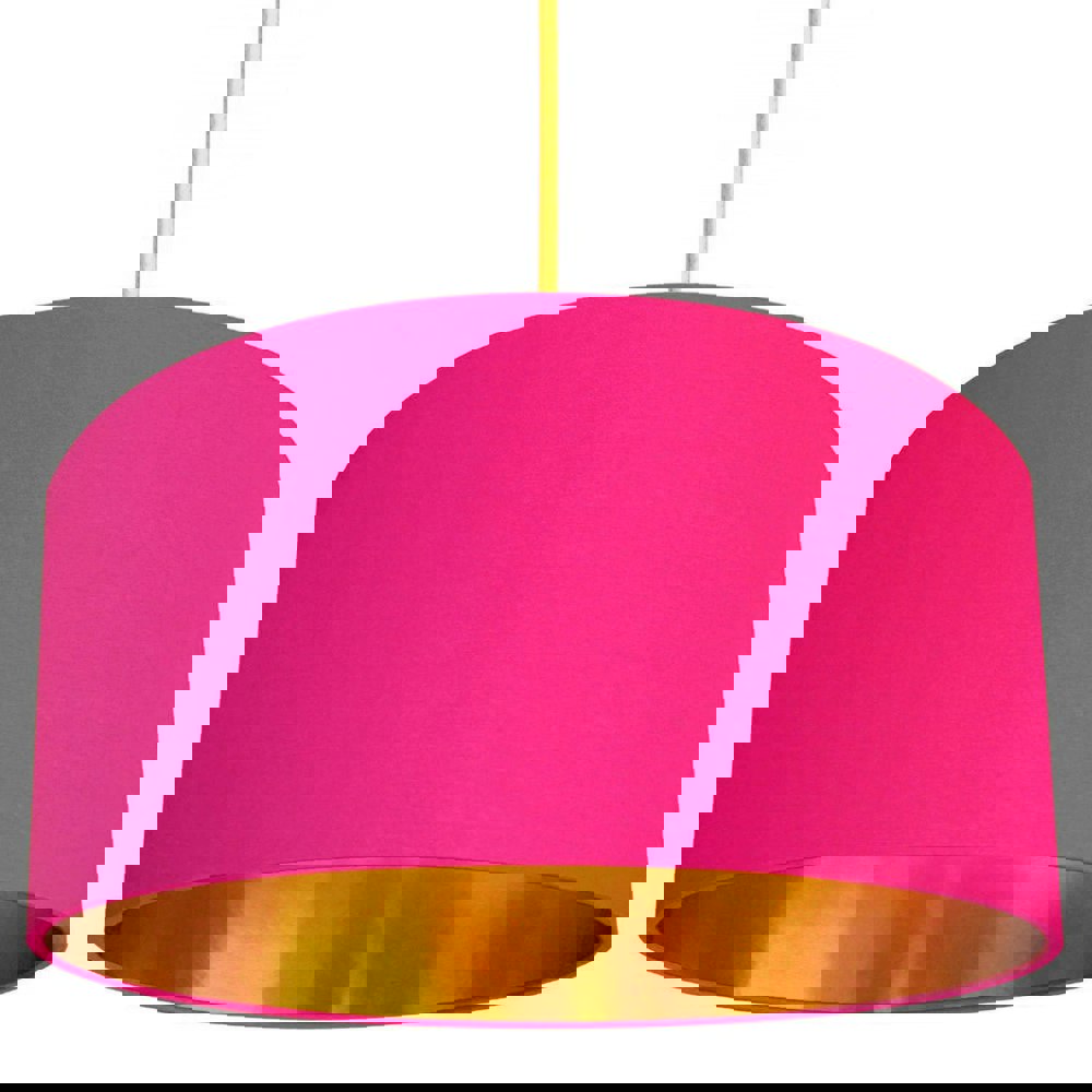 This lovely watermelon pink drum lampshade is made with a 100% cotton. Its lined with a rich and vibrant gold foil which gives a lovely warm, ambient glow to the room.