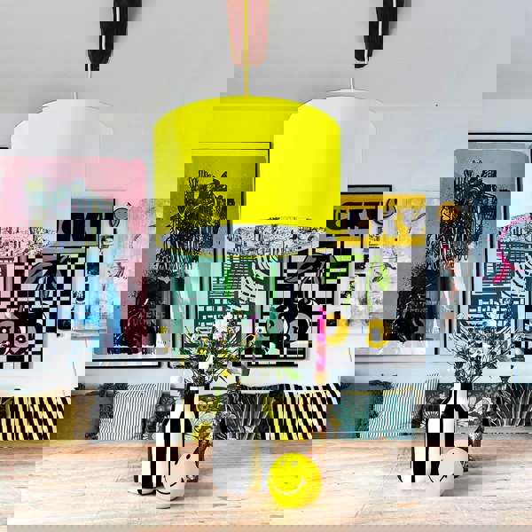 Crafted with joyful attention to detail, the lampshade’s exterior is adorned in a vibrant Acid Yellow cotton, creating a bold and eye-catching statement piece. But the true magic happens when the light is turned on, as the cactus-filled lining magically appears through the sides, casting a warm, inviting glow throughout your space.