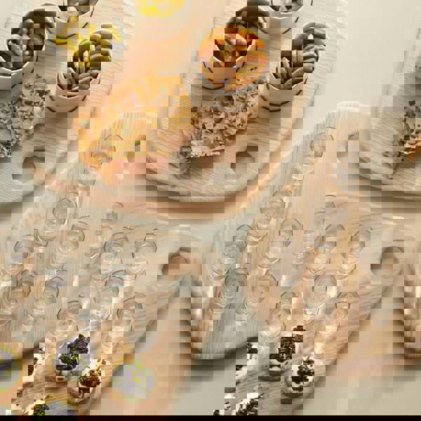 This stylish set includes six beautiful shot glasses, perfectly arranged in individual slots on an organically shaped ash wood top.