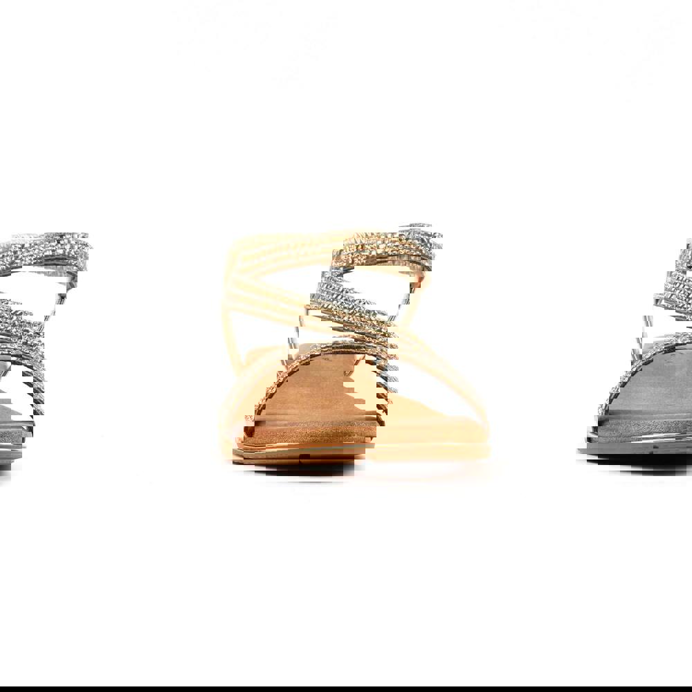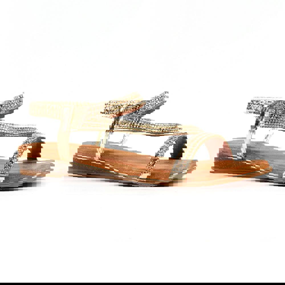 Lunar Womens Blaise II Pewter Sandals - Gold pair a flat profile with a glitter finish and a clean, plain design. The upper and lining are made from PU (polyurethane), with a padded insole for added comfort underfoot. An elasticated ankle strap fastening keeps the sandal secure while maintaining a streamlined look.