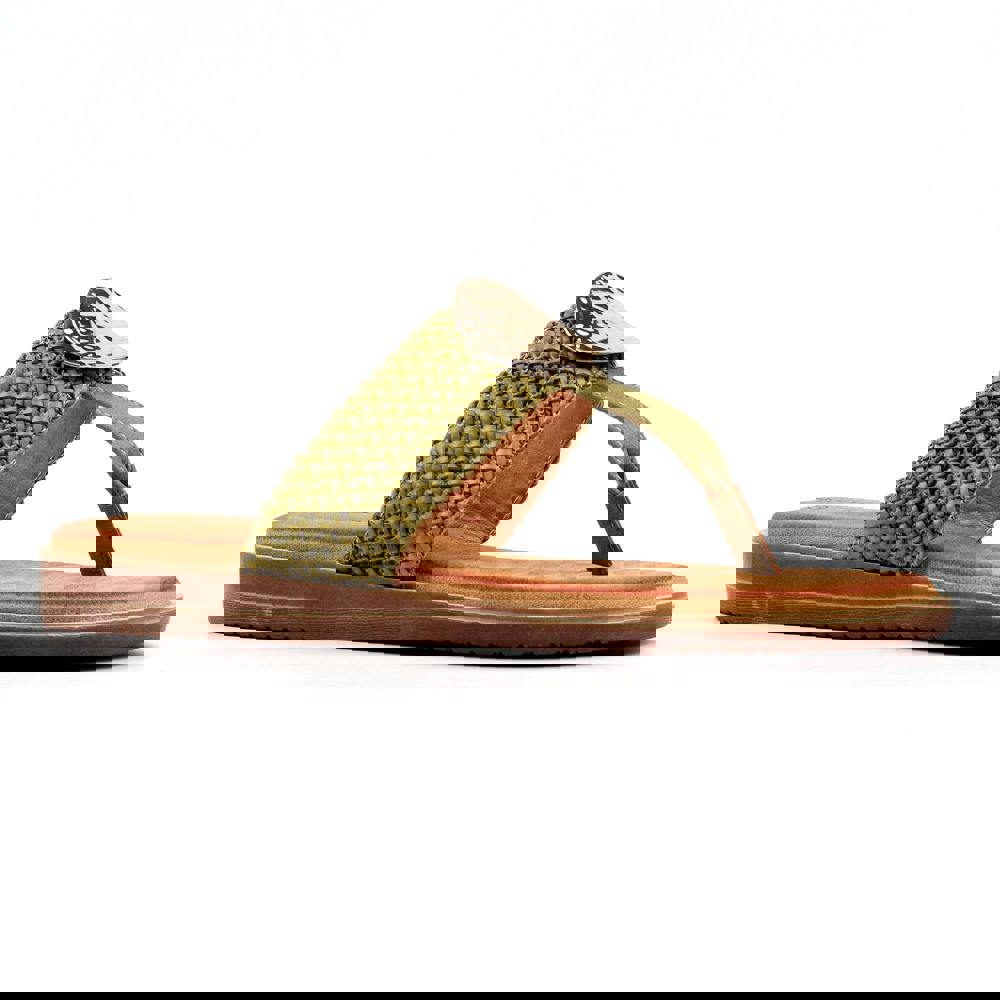 Lunar Fiona sandals in khaki with a flat, slip-on profile. The upper, lining, midsole and outsole are made from PU (polyurethane). A cushioned footbed and lightweight construction support easy everyday wear, while woven straps create a secure post-toe shape.