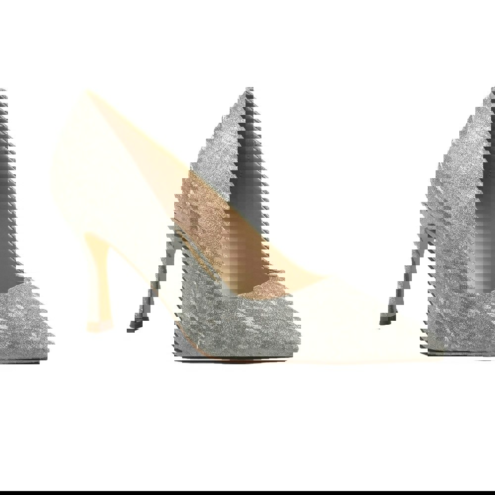 Lunar Jada court shoes in silver with a low-cut profile and slip-on fastening. The design combines logo detailing with metallic and swirl elements, finished with a pointed toe and stiletto heel. A padded insole adds comfort underfoot, while the synthetic upper, lining and outsole keep the look streamlined.
