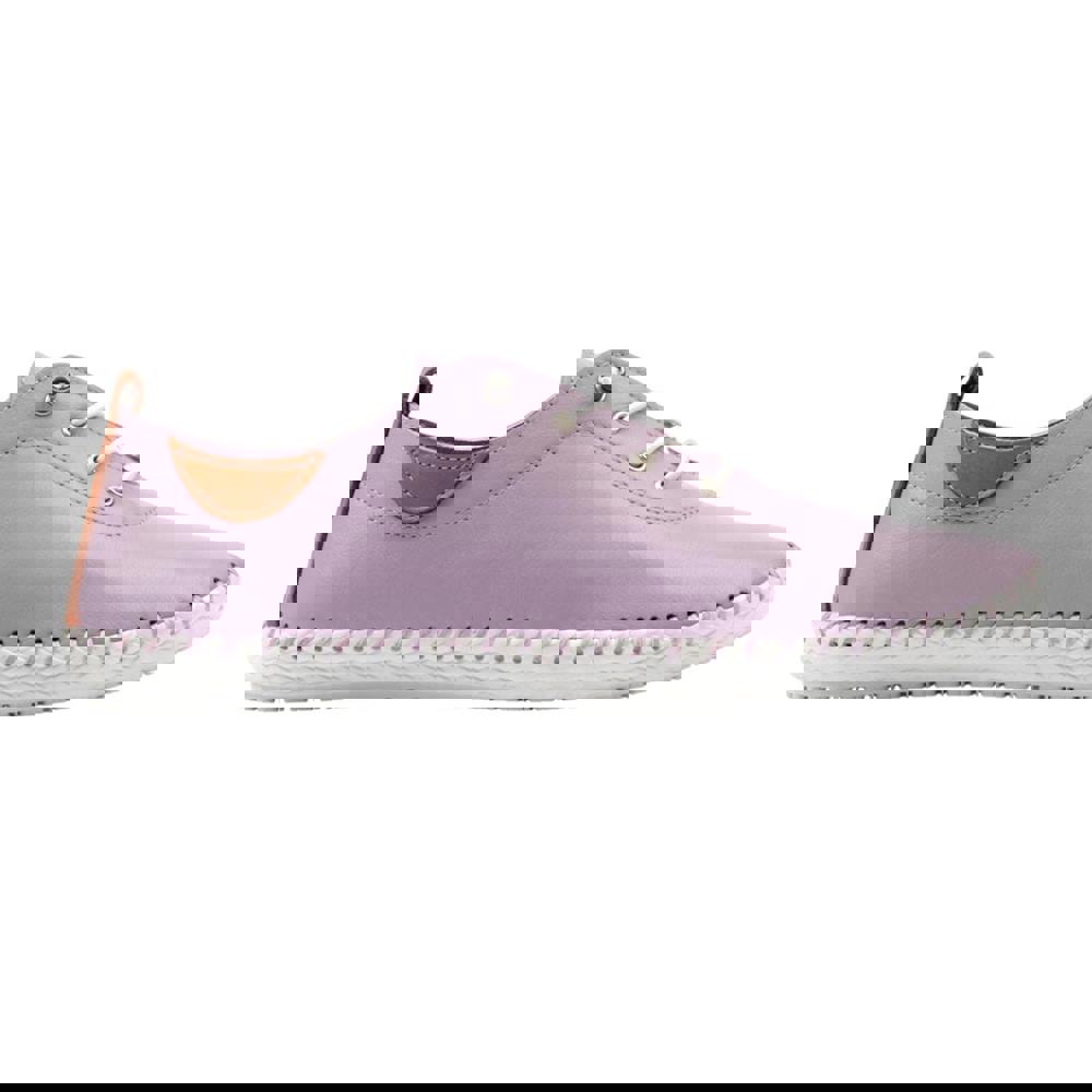 These Lunar women’s St Ives plimsolls combine a leather upper with an all-over leopard print in lilac. Cut to the ankle with a flat profile, they offer a round toe shape and a lightweight feel for everyday wear.
