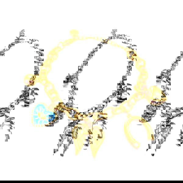 Amalfi is a joyful mix of symbolism and statement style. Crafted in 18k gold plating, this charm bracelet features a chunky chain adorned with meaningful details, a lucky horseshoe, angel wings, a heart charm and an enamelled evil eye for protection.