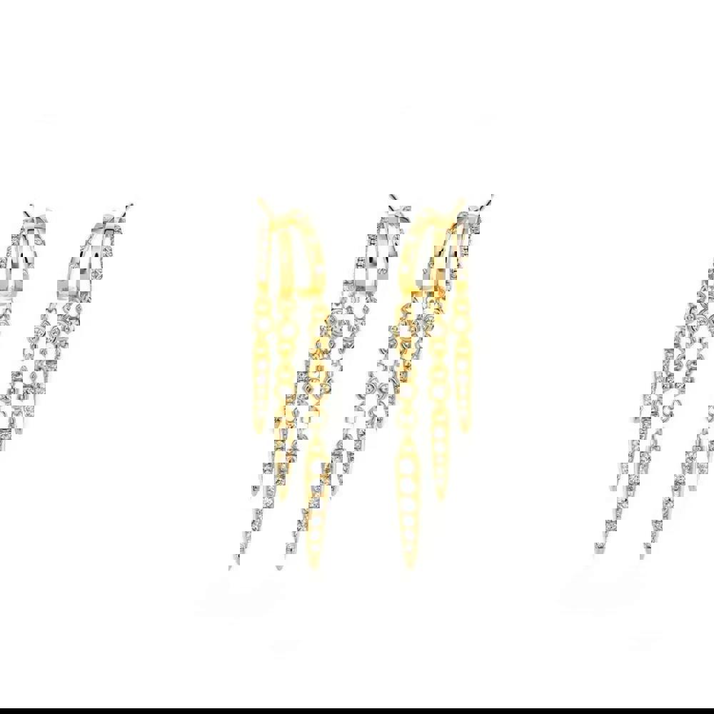 Aris is all about movement, shine and modern edge. These 18k gold plated drop earrings feature a trio of fine, crystal-set chains suspended from polished huggie hoops, creating a fluid silhouette that catches the light with every step.