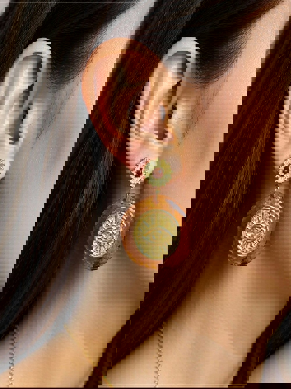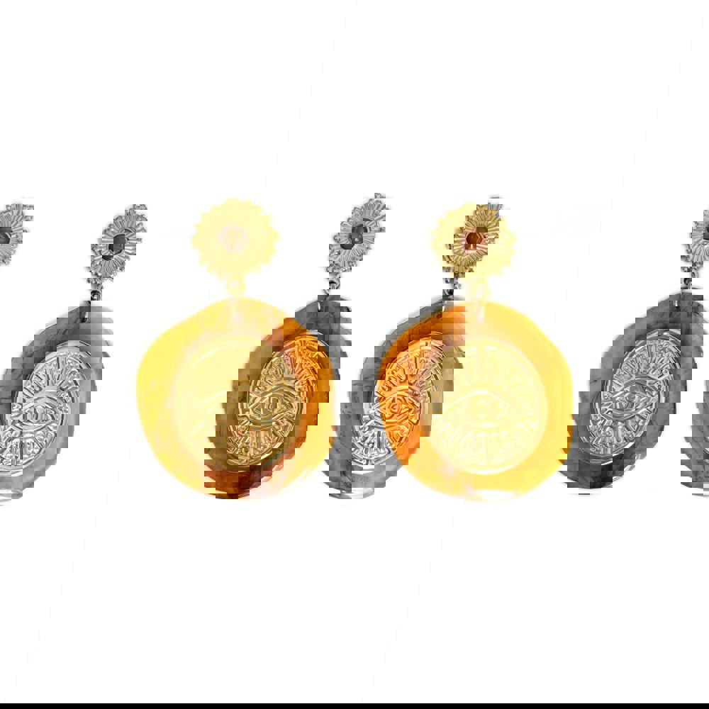 The Artemis Earrings are bold and symbolic drawing inspiration from ancient mythology and timeless artistry. Each earring features a radiant sunburst stud set with a warm amber toned stone flowing into a sculptural resin drop in rich honey hues. At the centre lies a golden eye motif etched with intricate detail a symbol of protection and inner strength.