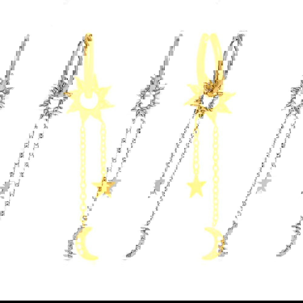 Elevate your jewellery collection with the Aura Earrings, a celestial inspired design crafted in 18k gold plated stainless steel. Featuring a radiant sun hoop that suspends delicate chains, each earring is finished with a polished star and a crescent moon adorned with subtle crystal accents.