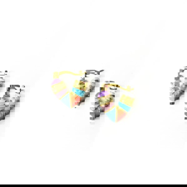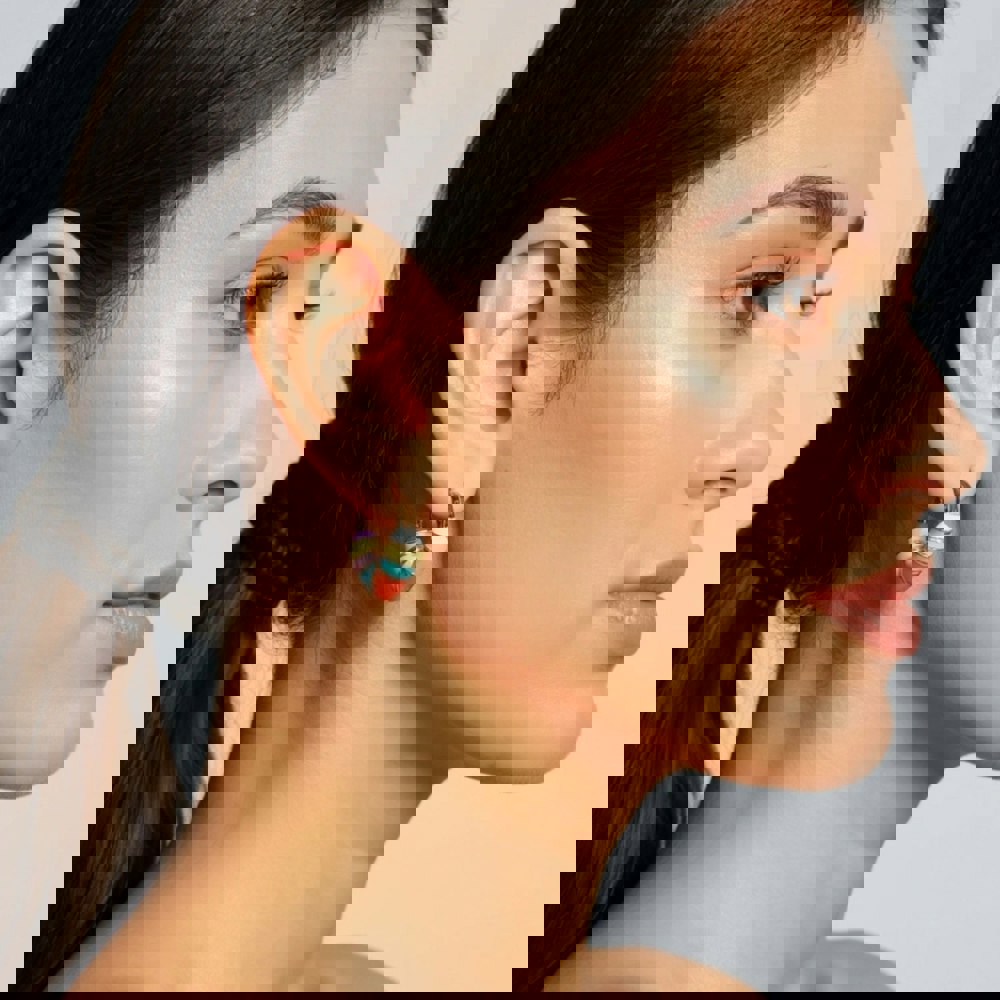 Add a splash of color to your everyday look with the "Capri" Pastel Heart Hoops. These bold, gold-plated hoops are wrapped in dreamy enamel stripes of lilac, blush, peach, and sky blue giving them a playful, retro feel that’s perfect for summer styling. Lightweight yet eye-catching, they're your go-to accessory for beach days, brunch dates, and festival fits.
