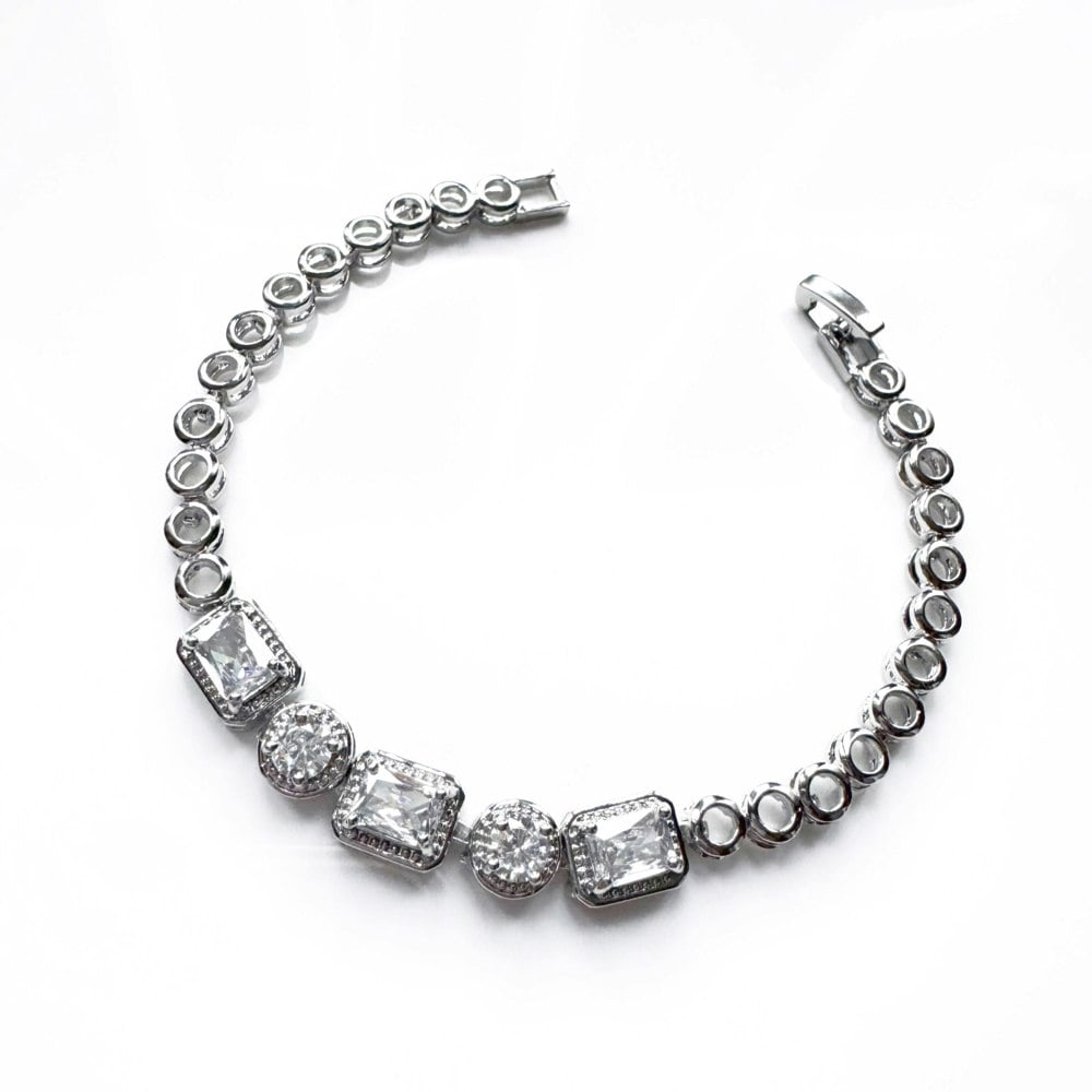 This Cielle bracelet features a series of alternating round and rectangular gemstones, each encased in a detailed bezel setting, creating a balanced mix of sparkle and structure. The larger, centrally placed stones include cushion-cut and round-cut gems, surrounded by fine detailing that enhances their brilliance. The remainder of the bracelet consists of smaller circular links, giving it a seamless, refined design. The clasp is secure yet discreet, ensuring both style and practicality. This bracelet is perfect for formal occasions or as a statement piece for everyday elegance.