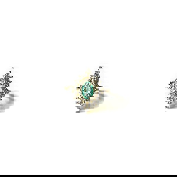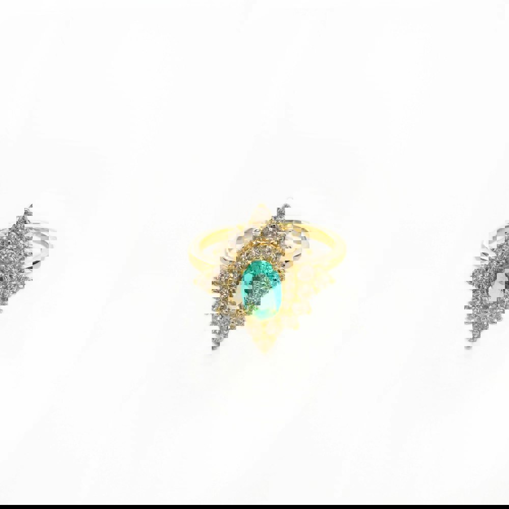 Designed for the modern woman with a love for vintage style, this gold tone ring features a radiant, oval-cut azure gemstone at its centre, surrounded by a shimmering halo of clear crystals that create a captivating sparkle. The intricate, starburst design and antique-inspired setting give it a sophisticated and unique charm, perfect for special occasions or as a statement piece in everyday wear.
