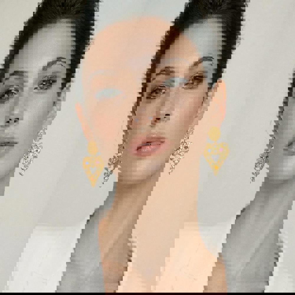Fortuna is a celebration of love, luck and destiny. These statement earrings feature a sculpted, hammered heart design in 18k gold plating, set with colourful stones that bring warmth, energy and a playful sense of romance.
