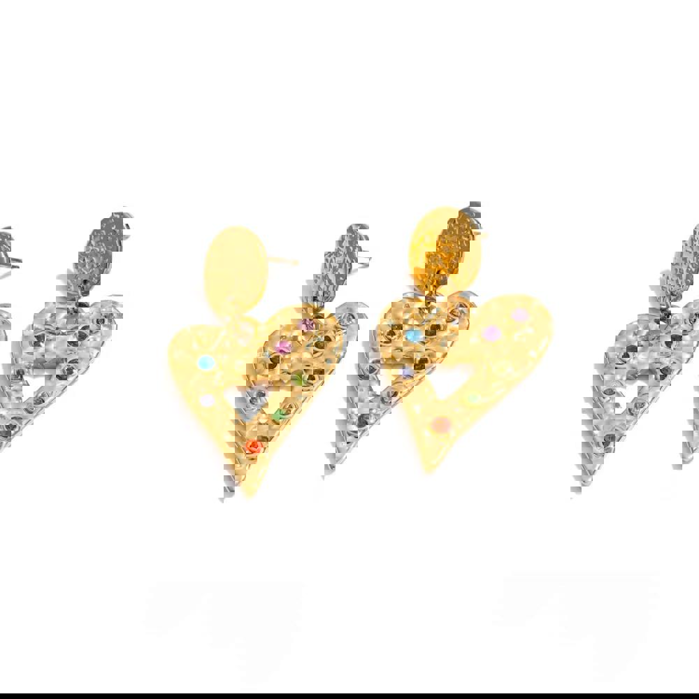 The softly textured gold catches the light beautifully, while the heart cut-out keeps the design light and wearable despite its bold shape. Each stone adds a pop of colour, giving the earrings a joyful, expressive feel — perfect for moments when you want your jewellery to say something without needing words.