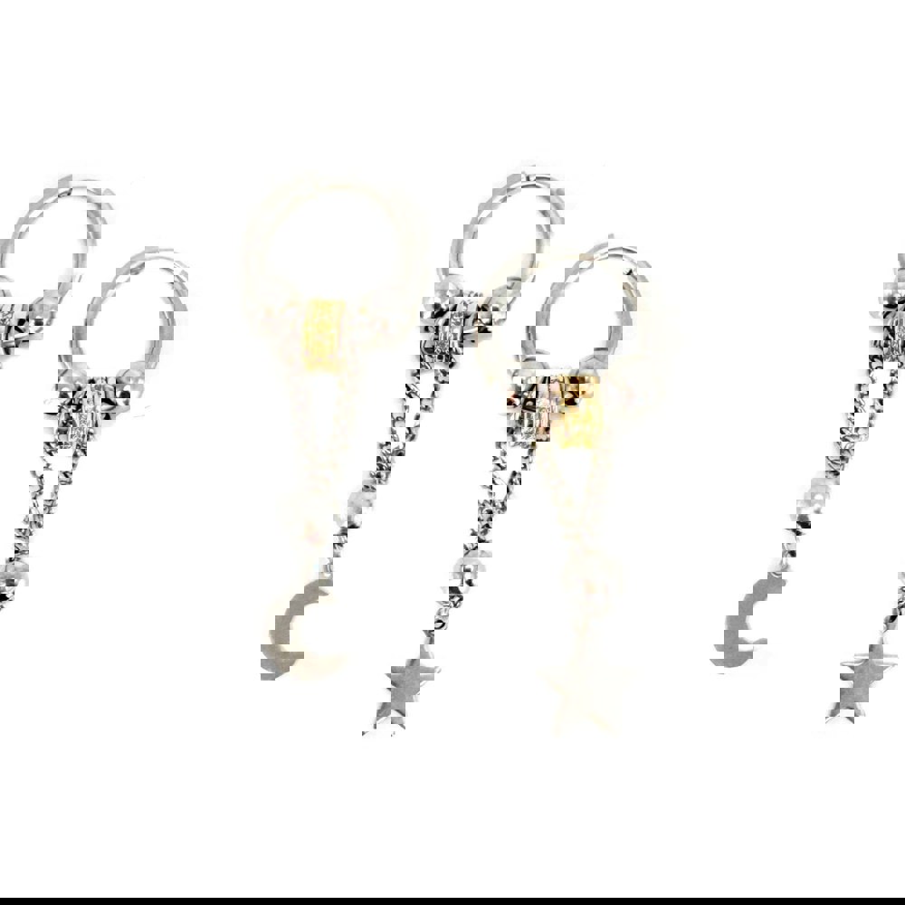 Channel mystical vibes with the Hecate earrings, a unique pair of silver hoop earrings inspired by the celestial and goddess Hecate. Featuring an enchanting crescent moon on one earring and a shimmering star on the other, each charm is elegantly suspended from delicate double chains, adding a touch of ethereal movement. The combination of silver and subtle gold accents gives these hoops a chic, bohemian appeal, perfect for adding a cosmic touch to any outfit. Lightweight and hypoallergenic, the Hecate earrings are designed for comfort while making a statement. Ideal for astrology enthusiasts or anyone looking to elevate their style with symbolic jewellery, these earrings are as versatile as they are captivating.