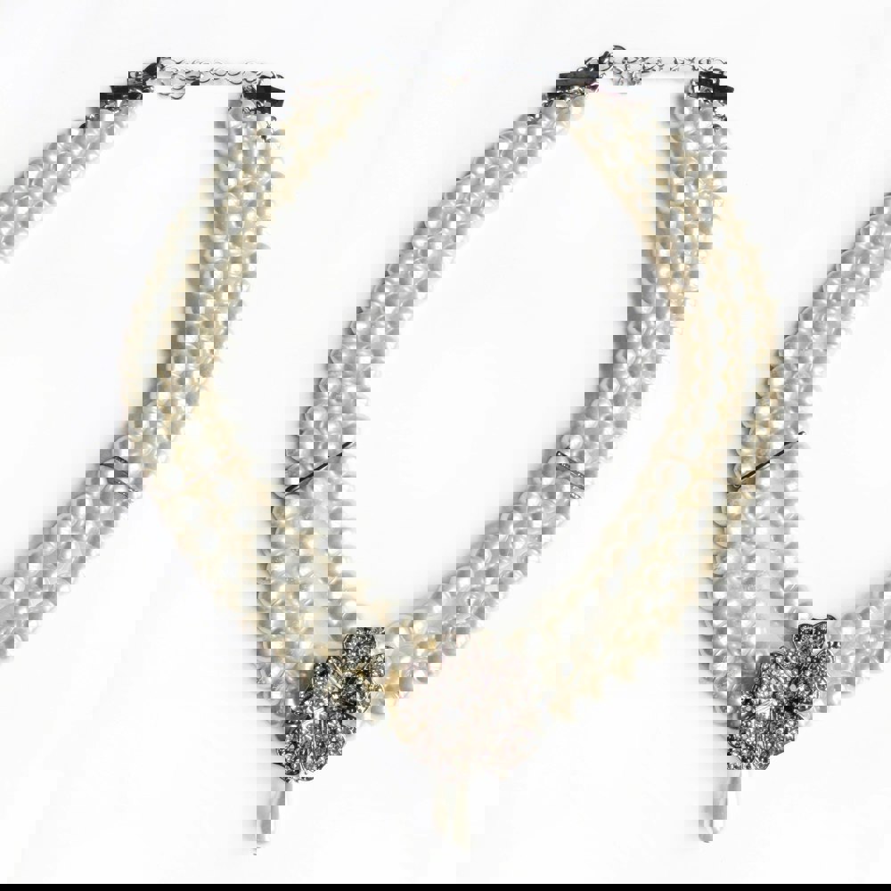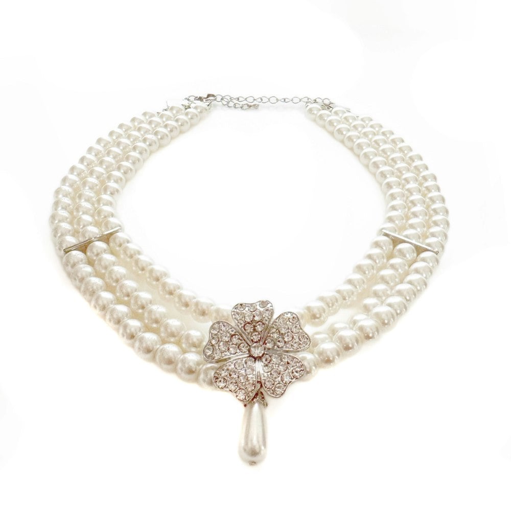 The Lily Vintage Inspired Pearl Necklace brings timeless elegance into the modern age. Crafted with three rows of lustrous pearls and finished with a crystal-studded floral centrepiece, this necklace captures the grace of old-world glamour while keeping its look fresh and contemporary.