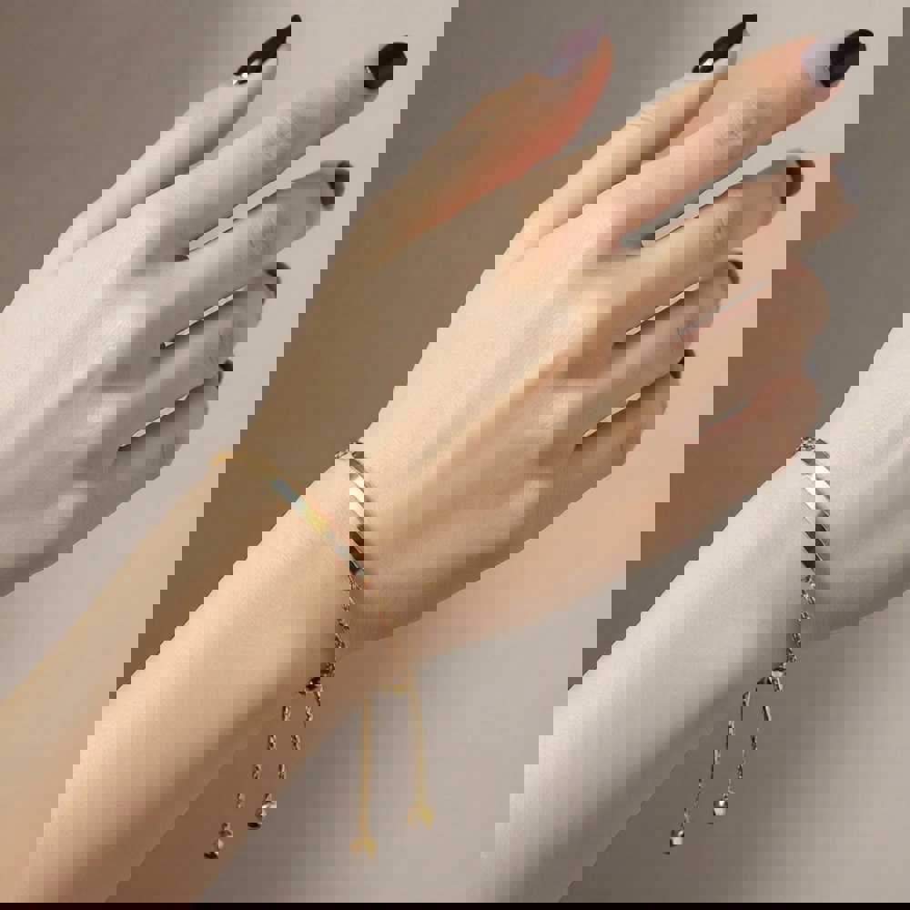 The Novie Bracelet is the definition of effortless elegance. Plated in rich 18k gold, it features a refined, textured chain that catches the light with every movement. The smooth slider fastening allows you to adjust the fit in seconds, giving you that made-for-you feeling without any fuss.