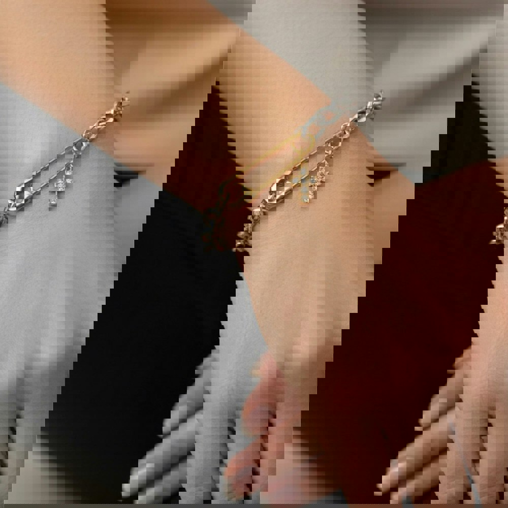 The Roxy Bracelet is a bold statement piece that blends industrial edge with refined detail. Designed with a chunky silver chain it is accented by a striking gold safety pin charm that holds a delicate cross set with sparkling crystals. The contrast of metals and textures gives this bracelet a contemporary feel with a touch of rebellious glamour.