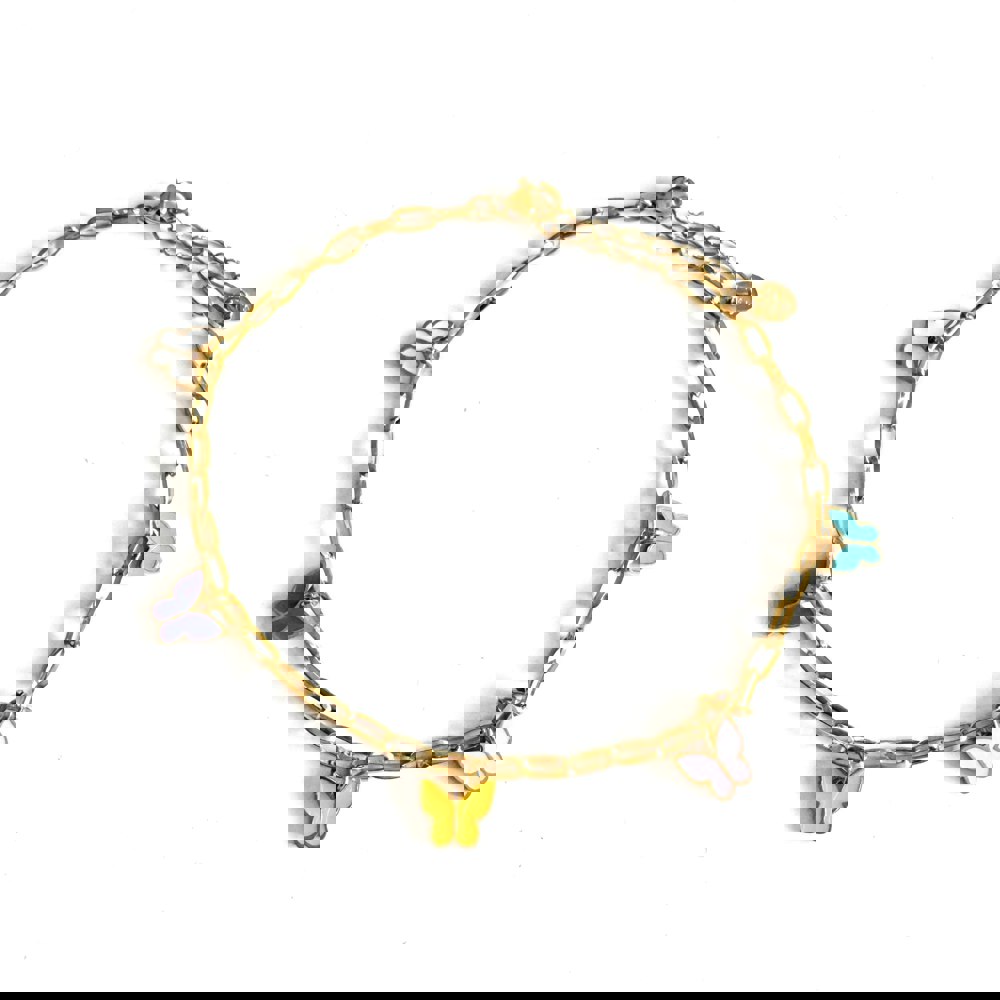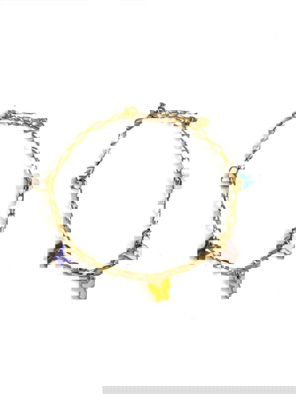 This gold butterfly charm anklet is a playful and colourful addition to your summer jewellery collection. It features five delicate butterfly charms in soft pastel shades including white blue yellow pink and purple. The lightweight gold chain has an adjustable length so it sits comfortably around your ankle whether you're heading to the beach or dressing up for a sunny day out.