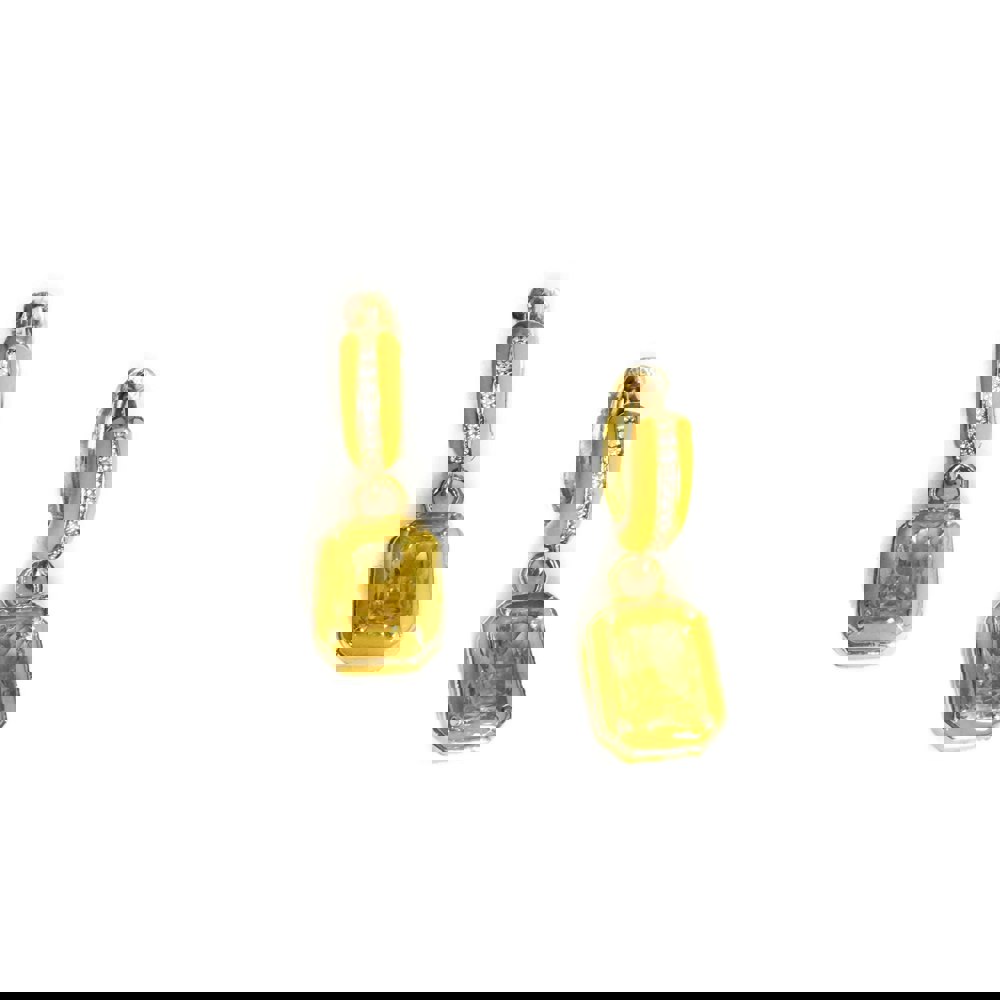 Illuminate your style with these exquisite yellow enamel drop earrings, designed to add a touch of luxury to any outfit. Featuring radiant faceted yellow gemstones set in a gold-tone frame, these earrings exude sophistication and charm. The huggie hoops are elegantly adorned with shimmering pavé crystals, offering a refined sparkle that complements the vibrant enamel and gemstone combination. Lightweight and versatile, they’re perfect for elevating your look.