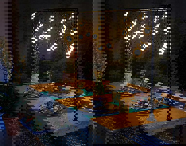 This cosy party lighting from Luxform Lighting is equipped with an ultra safe 24V transformer. The set is supplied with either 10 or 20 opal coloured G50 bulbs which offer a super stylish yet classy look. There are 8 different setting options available, including sequential, flashing, twinkle and the option to turn on and off when desired. These party lighting bulbs can be placed anywhere in the garden, in trees, over tables or even draped over a pergola. The bulbs are spaced every 50cm and a generous 3 meters from the 3. 6 W 24V transformer to the first bulb. With an IP rating of IP44 this party lighting can be hung both indoors and outdoors and has a super bright 10 Lumen output and A++ energy rating.