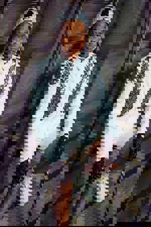This Maison Ava Nick suit set in white pairs a long-sleeved top with matching cotton silk shorts. The top uses a textured material with metallic floral embroidery, finished with ribbed trims and a satin lining. A zip-up fastening keeps the front clean, while an embroidered brand tag adds a clear signature detail.