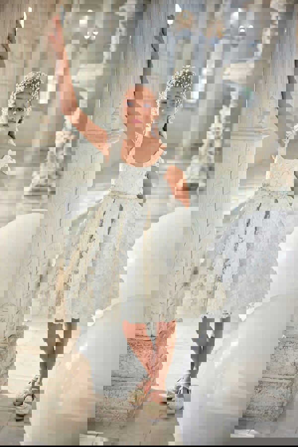 This girls Ariel occasion dress by Maison Ava comes in ivory with a layered tulle design and intricate butterfly and floral embroidery. Micro beads and sequins add detailed embellishment, while tiny sleeves and a decorated waistband complete the look. A zip-up fastening keeps the finish neat, and an enlarged detachable bow sits at the back for a statement detail.