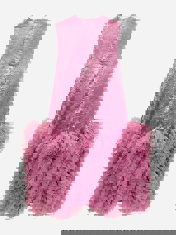 Maison Ava brings a handmade approach to occasionwear, with a focus on craftsmanship and detail. This girls’ pink dress is made in sheer satin with a tiered tulle skirt, set on a crew neck base. A sleeveless cut and zip-up fastening complete the clean, structured finish.