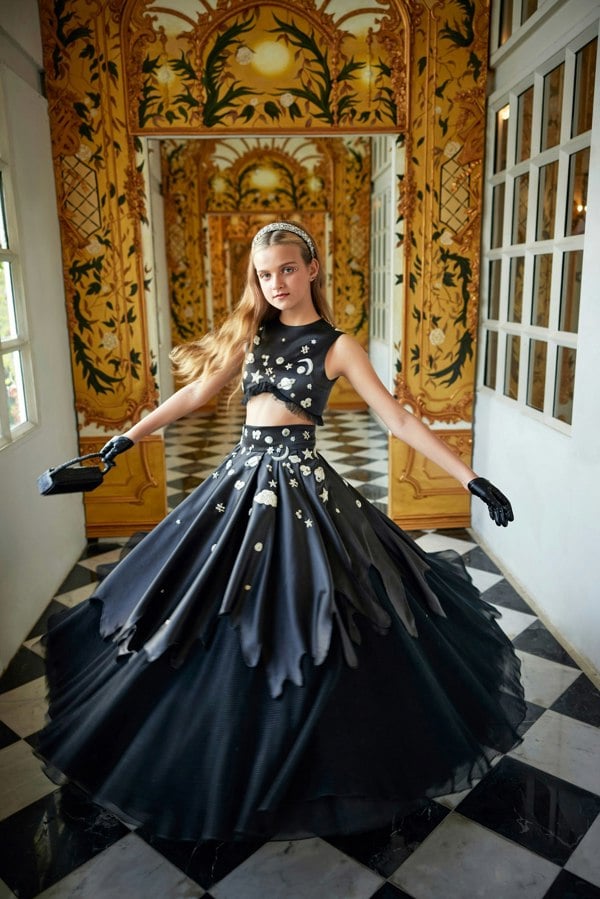 This girls’ black occasion dress from Maison Ava draws inspiration from Netflix’s Wednesday, with a gothic look and bold detailing. The design includes a cut-out top and a dramatic hem finished with satin and netted stitching. Star and moon micro bead symbols add decorative detail across the dress, paired with a netted, layered tulle construction and a banded underskirt.