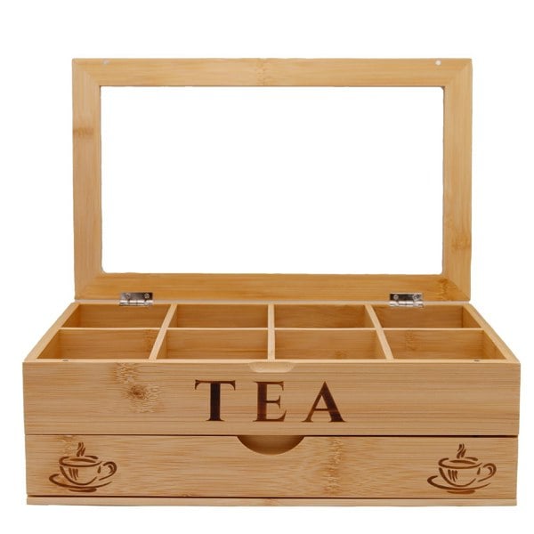 The design's hidden gem is the seamless, slide-out drawer located at the base. This convenient, full-length compartment provides the perfect hidden storage for all your essential tea accessories, such as honey sticks, sugar packets, spoons, and infusers, ensuring your kitchen space remains tidy. This beautifully designed tea box is a wonderful and thoughtful gift for any tea enthusiast in your life.