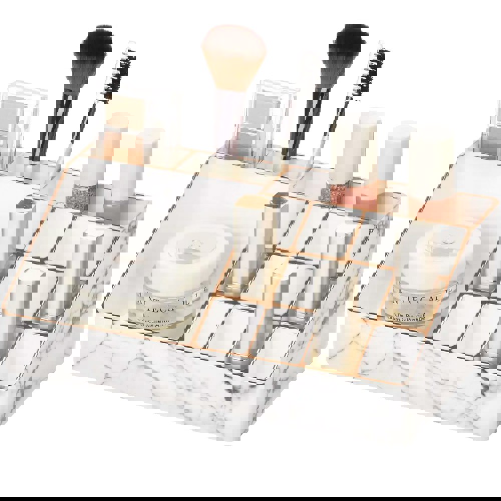 Elevate your vanity with this chic marble-look makeup organizer! Crafted from durable PS material, this organizer provides stylish storage for your makeup brushes, lipsticks, palettes, and other essentials. Keep your cosmetics organized and within easy reach, adding a touch of luxury to your bathroom or bedroom.
